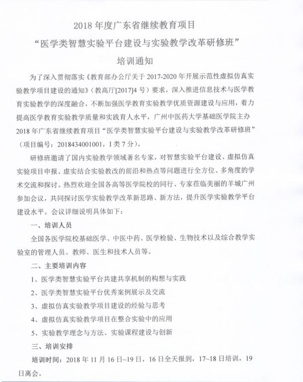 2018年度广东省继续教育项目“医学类智慧实验平台建设与实验教学改革研修班”培训通知