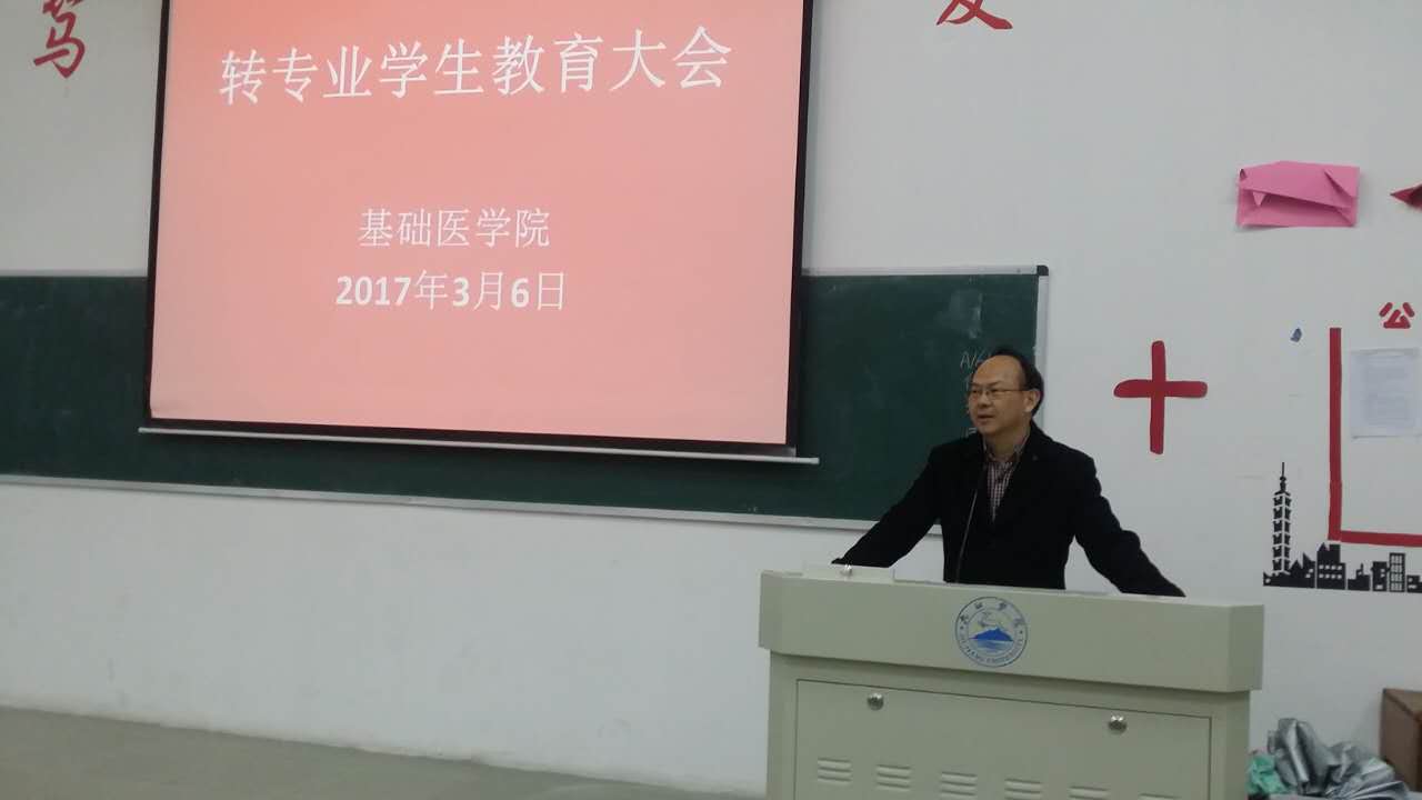 基础医学院于3月6日晚6:30分,在华文楼阶二教室召开了2016级转专业学生教育大会,基础医学院院长车向新、党委书记余朝阳、副院长郑美蓉、副院长汪鑫教授、教学科研管理科、学生科、团委、转专业班级班主任、辅导员参加了会议,会议由教学科研管理科副科长牛力主持。