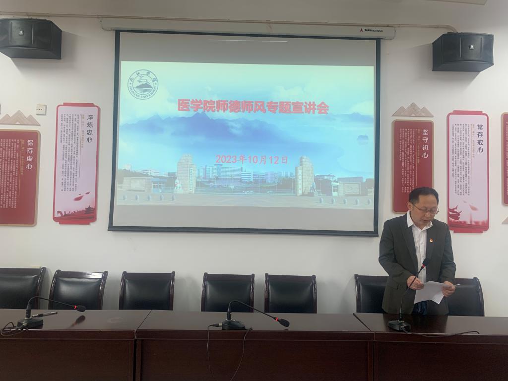 10月12日下午,医学院召开了师德师风宣讲会,邀请校师德师风宣讲团成员、附属口腔医院院长、主任医师汪文丰做专题讲座,医学院班子成员、各科室负责人、青年教师和学生代表参加了宣讲会,会议由党委书记许晓源主持。