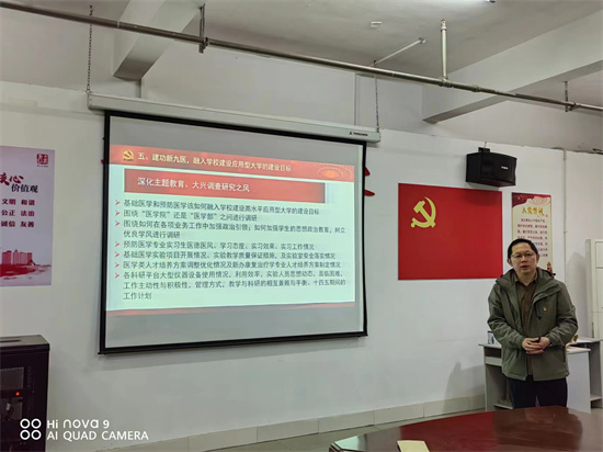集中学习会后,许晓源以《奋进新时代 建功新九医——学习贯彻党的二十大精神》为题为读书班上专题党课他从党的二十大的概况和重大意义,新时代十年的伟大变革和历史性成就、新时代新征程中国共产党的使命任务、新时代新征程的重要部署和战略举措以及建功新九医,融入学校建设应用型大学的建设目标五个方面进行了深刻解读,并对深化主题教育,大兴调查研究提出了明确要求。