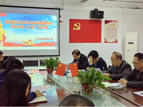 10月27日,医学院党委在华文楼105会议室召开10月份党委理论学习中心组(扩大)学习会议学习二十大报告精神。党委委员,党支部书记,各科室、教研室、实验室负责人参加会议。会议由院党委书记许晓源主持。民主党派教师代表及药生学院、资环学院、护理学院组织员列席会议。