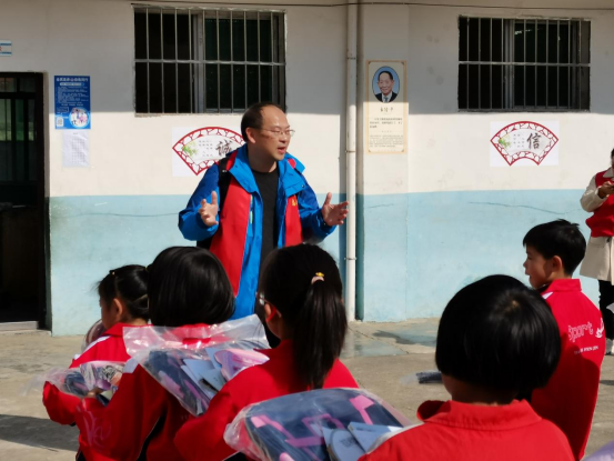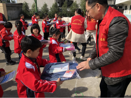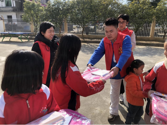 志愿者们为小朋友发放爱心物资,书包、书本、跳绳等。递过去的不仅仅是一件书本,更是每一名党员志愿者对山区小朋友们的关爱。