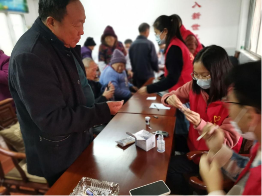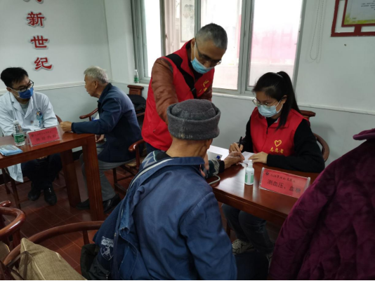 活动室内,志愿者们协助附属医院义诊专家开展义诊活动,大家耐心地为老人家量血压和测血糖等筛查服务,并普及健康科普知识,倡导健康文明生活方式。