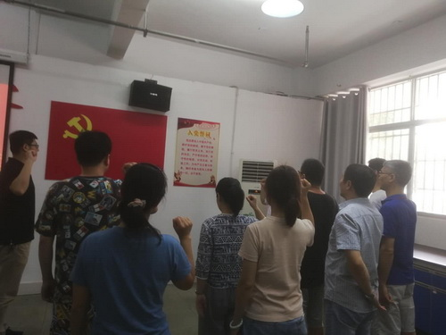 会议伊始傅文学同志领誓,全体党员高举右拳重温入党誓词,神情庄重、声音铿锵,通过重温入党誓词,再一次体会到作为一名共产党员的责任感和使命感。随后支部书记张杰同志重读入党申请书,15年前对中国共产党的仰慕之情跃然纸上,对加入中国共产党的期盼之情深刻心中,回想起当年为了入党,处处争先进的激情岁月,张杰同志坚定表示初心不改,矢志不渝,为共产主义事业奋斗终身。