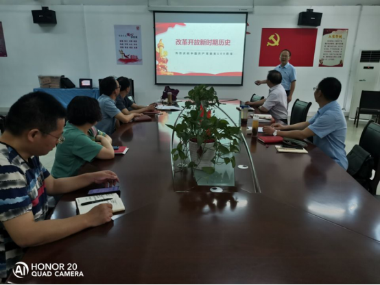 6月25日,由车向新同志以“改革开放新时期历史”为主题,为全体党员讲授专题党课。从建设有中国特色的社会主义提出背景、确定继续前进的正确道路、战略步骤和方针政策、开创社会主义现代化建设新局面、沿着中国特色社会主义道路继续前进,改革开放的未来思考等五个方面介绍了改革开放新时期的历史。