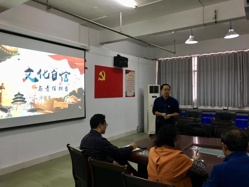 许晓源同志分别从“文化自信的含义是什么”、“文化自信的底气来源”、“文化自信的重要意义”、“如何增强文化自信”等四个方面给全院党员上了一堂生动的党课。通过本次党课培训,让从事高校教育工作者的党员干部们深刻认识到,首先从自身做起,充分认识文化自信的重要性,也充分认同中华文化的伟大,同时教育好学生,在传授专业知识的同时,加强课堂思政,将文化教育进入专业课堂,引导学生加强对中华文化的认同,帮助他们坚定文化自信,让他们都成为充满文化自信的专业人才。
