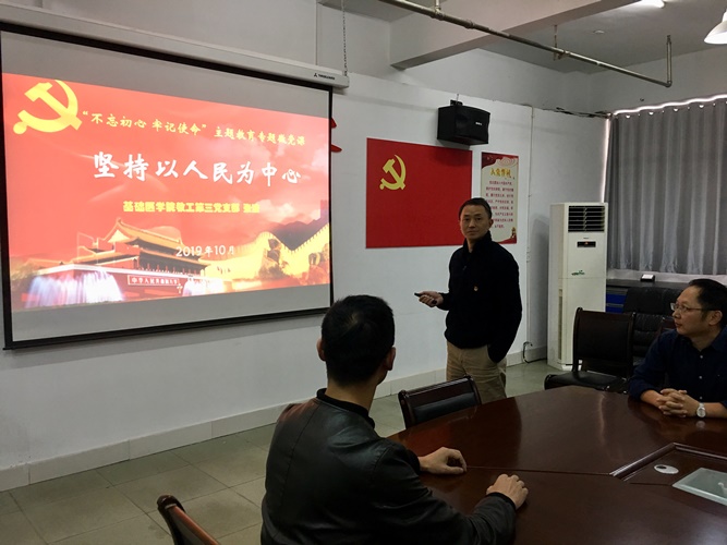 10月17日下午,基础医学院按计划在华文楼105会议室召开“不忘初心、牢记使命”主题教育党员集中培训会。学院党委委员许晓源同志结合高校党员教师的职责做了《文化自信与责任担当》专题辅导,学院党委班子成员及全体党员参加党员培训。