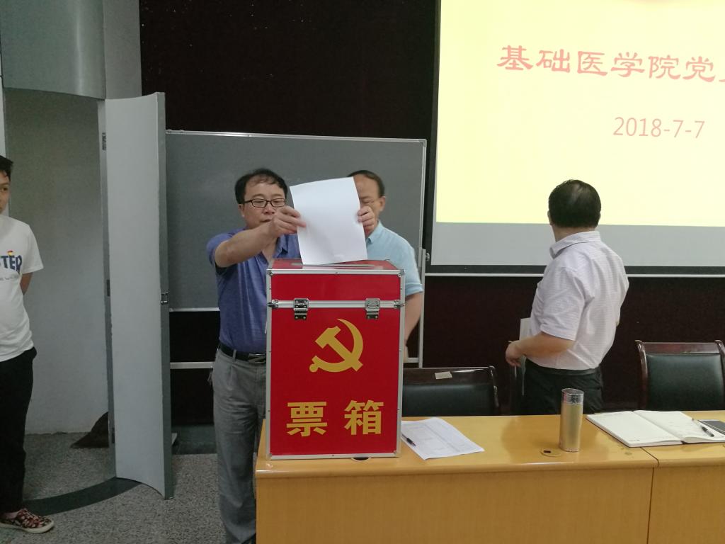 大会首先以举手表决的方式审议通过了《中共九江学院基础医学院党员大会选举办法》,表决通过了监票人、计票人名单。余朝阳书记逐一介绍了代表候选人基本情况。随后,全体正式党员对代表候选人进行了无记名投票,选举产生了基础医学院出席中共九江学院第一次党员代表大会的代表6名(以姓氏笔画为序):车向新、余朝阳、杨耀防、郑美蓉、龚帧、傅文学。