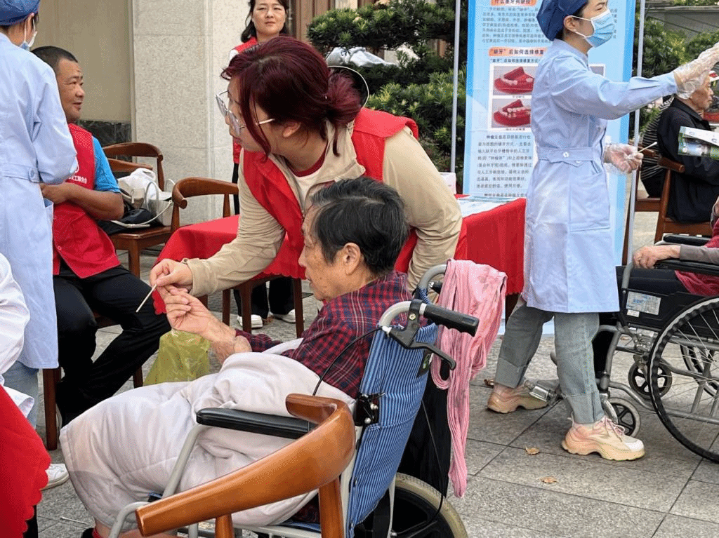 在这期间,九江学院基础医学院学生志愿者分工明确,一部分搀扶着老人或者推着轮椅带老人家义诊、剪发和剪指甲,一部分则陪伴老人家在院子里晒太阳聊天,活动氛围其乐融融,充满了欢乐。