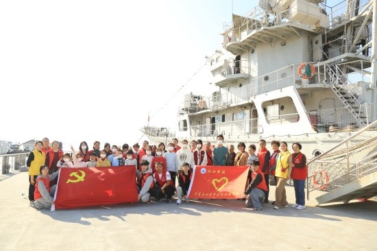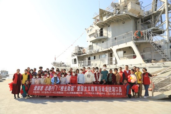 上午十一点,党员志愿者们从九江学院出发前往湖口市博物馆与“橙光宝贝”们汇合,然后共进午餐。午饭后,志愿者和小朋友们一同参观九江舰爱国主义教育活动基地,学习军事知识和爱国主义精神。一位在九江舰上坚守36年的老兵向全体参与者讲解了九江舰的历史、带领大家参观九江舰。在参观过程中,孩子们认真听讲,积极提问,兴奋之情溢于言表,对九江舰的光荣历史和人民海军保家卫国的坚强决心和强大能力表达了由衷的敬佩。