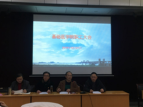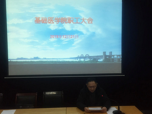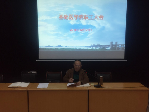 12月21日下午,基础医学院在浔东校区立本楼三楼报告厅召开了职工大会,学院领导班子以及全体教职工参加会议。会议由党委委员傅文学同志主持。
