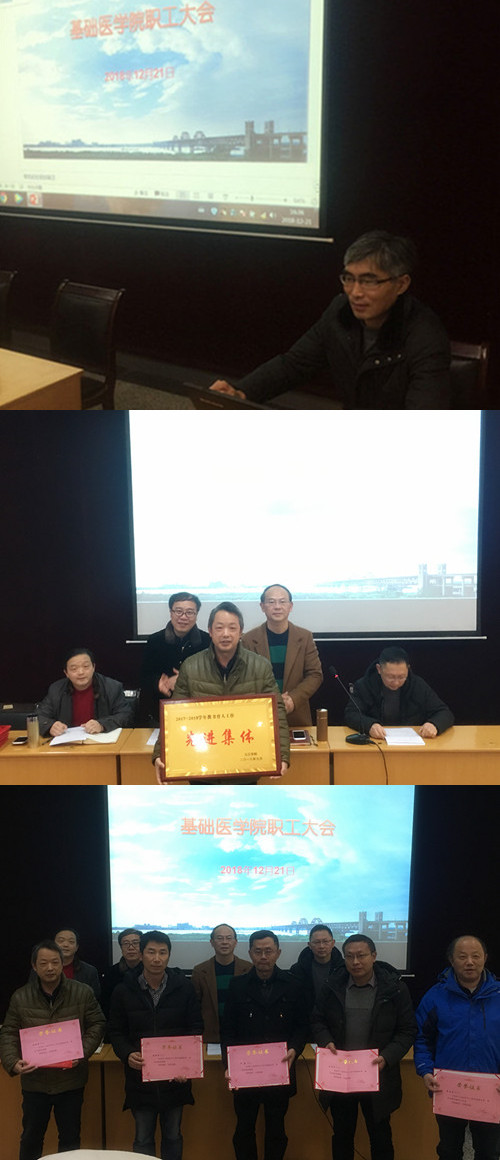 会上,学院还开展了教学论坛活动,基础医学实验中心赵勇老师汇报了第三届中国医学模拟教学联盟大会暨中国健康医学教育PBL联盟大会的参会情况,分享了通过人工智能的医学模拟和PBL交融提高医学教学质量的改革探索,为全体教师对未来医学教育采用“互联网+”教学手段带来更深的认识和理解。随后,学院领导为荣获九江学院2017-2018学年先进集体和先进个人颁发了荣誉证书。
