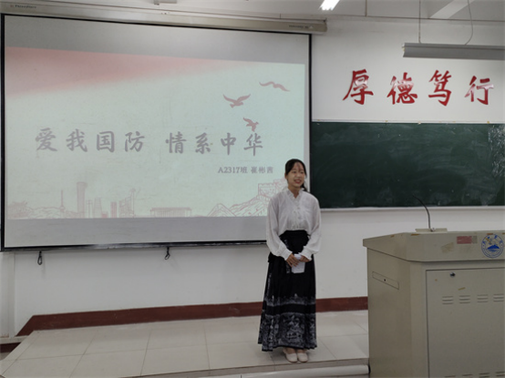 在主持人掷地有声的开场白后,比赛正式开始。参赛选手们紧密联系自身生活和学习经历,多层次、多角度地讲述了自身对于国防事业的理解。有的选手结合学习贯彻习近平新时代中国特色社会主义思想主题教育,抒发对实现中国梦、强军梦的理解感悟;有的选手通过讲述近代以来仁人志士为中华崛起而奋力求索的事迹,来表现对弘扬民族精神、传承红色基因、用青春报效祖国的理解;有的选手总结参加军训的实践体会,讲述家人参军入伍报效祖国的事迹,抒发对从军报国和以实际行动筑梦国防的情怀。选手们的演讲在形式上有所创新,在情感上慷慨激昂,整个比赛过程精彩纷呈,赢得了现场观众的阵阵掌声,将现场氛围推向高潮。