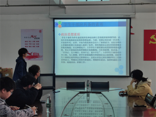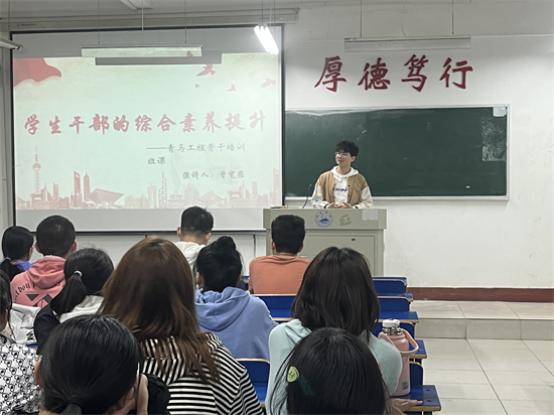 3月,主席团成员徐伟宣于华文楼105为大二学生干部开展讲课活动,内容为“学生干部应具备的素质”,徐伟宣向大家讲述了学生干部应具有政治思想素质、能力素质、心理素质、团队素质。学生干部要从四个方面不断加强自己,培养自身的综合素质和能力,更好地发挥学校、老师与学生之间的桥梁纽带作用。4月校园文明志愿服务中心负责人曾宪维于大学生骨干培训班向大一学生干部讲述了学生干部如何提升自身的综合素养。他向大家介绍了学生干部的职能,是连接老师与学生的桥梁,是学校与学生之间的纽带,学生干部要明确自己的身份定位,首先是一名学生,再是一名干部。曾宪维还从自身的学习工作经历出发,向大家讲述如何做好一名学生干部,最大地发挥作用,服务老师同学。