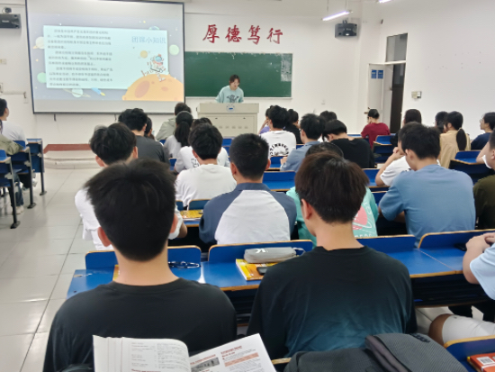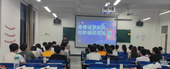 在义丰楼401,A2214班团支书借助PPT给同学们讲解了中国航天历史的发展,中国航天日的意义,随后向大家介绍设立航天日的目的,激发起同学们学习航天人自主创新、发奋图强的敬业精神。最后,团支书为大家拓展了团徽的相关知识。