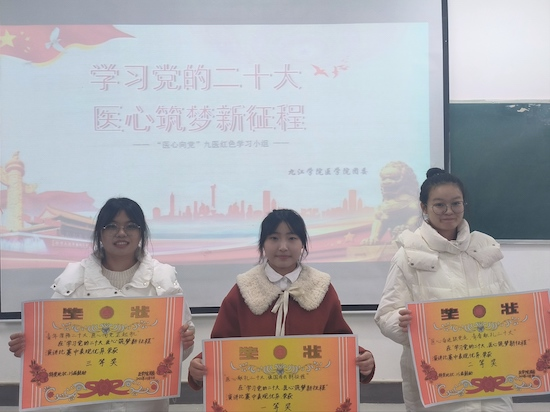 比赛准备阶段,大家积极踊跃报名并自发组织小组练习挑选出符合主题的演讲内容,并探索新颖的表演方式。比赛开始,各组同学精神饱满、声情并茂,演讲不拘一格、形式新颖,极富有艺术感染力和吸引力,体现了当代青年大学生的创新能力。各组演讲紧紧围绕党的二十大,从学习二十大精神、学习二十大代表人物、歌颂新时代十年伟大变革和认真学习习近平总书记的青年寄语等多个方面进行演讲。比赛现场精彩纷呈最后经由评委打分评比出获奖小组 “聚焦二十大代表奋进新时代征程“医心献礼二十大强国有我新征程”荣获一等奖两组表现优异,精彩绝伦歌颂了新时代中国的伟大变革,演讲内容振奋人心,紧扣党的二十大主题“青春弘扬杏林志百年党史照初心“出发我们的二十大“医心奋进跟党走青春献礼二十大”荣获三等奖。三个小组演讲声音洪亮自信大方,以演绎加朗诵的形式突出主题——二十大精神。“青春献礼二十大笃医奋进向未来“落实二十大精神奋进新征程“青春深悟二十大医心向党正起航“非凡这十年”荣获三等奖四组同学演讲热血沸腾积极向上比赛过程中秩序井然,活动顺利进行。随着最后一小组的演讲结束,比赛迎来尾声,由各位评委为获奖小组颁奖大家不仅从活动中更加深刻的理解与学习了党的二十大精神,同时也展现出了医学院学子“医心向党”的精神风貌。