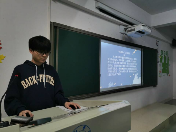 在班会上,各班创新委员首先向同学们强调了大学生创新创业实践课是综合教育必修课程,进一步阐述了该课程的内涵。接着,创新委员结合幻灯片解读了大学生创新创业比赛,并详细介绍了江西省对大学生创新创业的鼓励与政策支持。为了进一步地调动同学们参与比赛的积极性,创新委员还列举了许多大学生创业成功的案例,同学们都认真地听讲,并对创新委员提出的问题做出了积极的回应。
