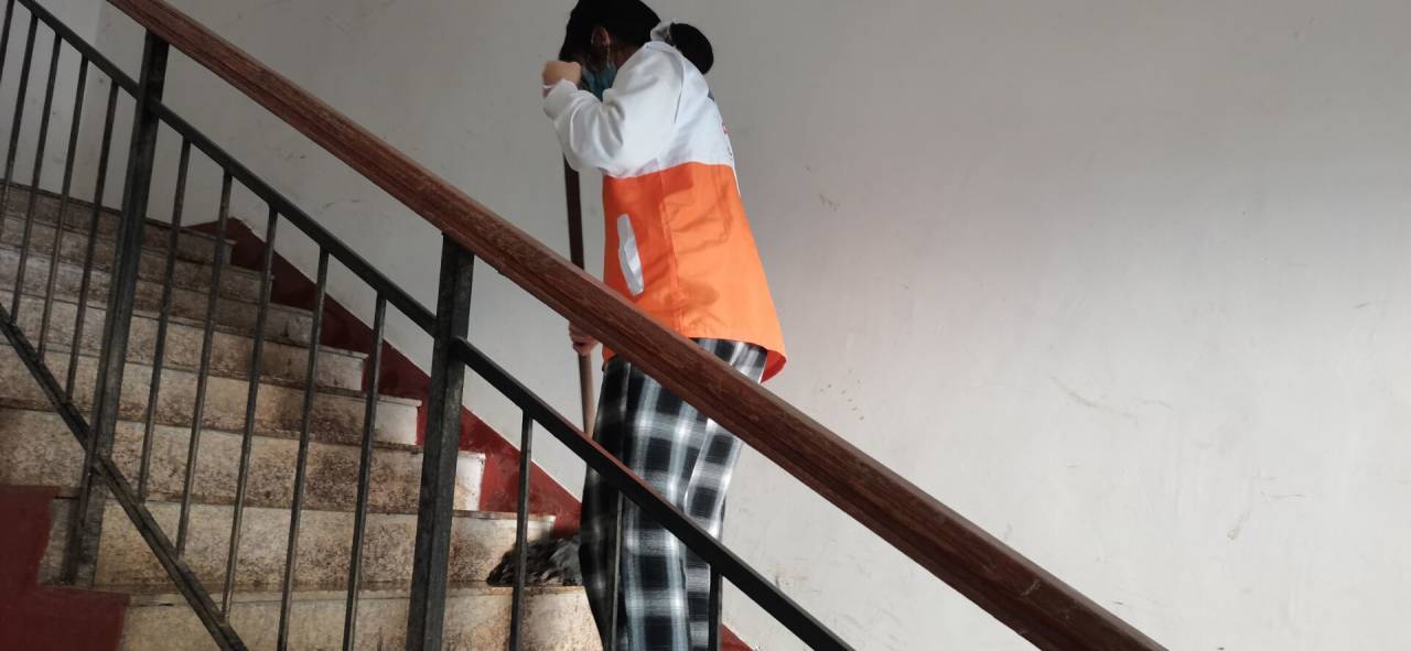 志愿者们乘坐公交车到达慧龙新城社区与基础医学院党委书记许晓源以及熊建军、张杰两位老师会合,并在社区负责人的带领下分配任务,开展志愿活动。第一项任务是帮忙社区的卫生清洁人员清扫社区,第二项任务是帮助和引导社区居民参与医生们的义诊活动。