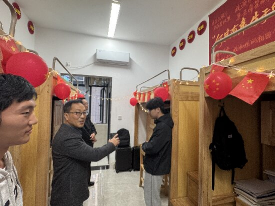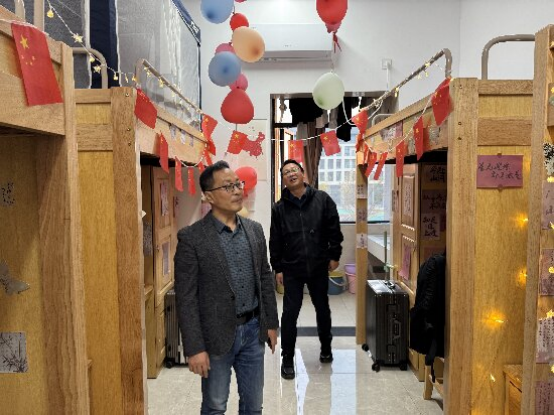 张辉饶有兴趣的参观了学生寝室,他提出寝室是同学们在校日常学习生活的重要场所,需要维持一个宁静、整洁、安全的环境,对寝室进行创意美化的同时也要时刻谨记安全用电、合理用电,营造健康、高雅、积极向上的文化氛围。