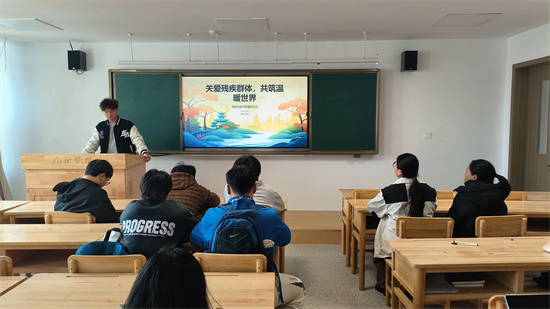 在研究生楼330,医学A2251班团支书在活动中为大家讲到:“每年12月3日的‘国际残疾人日’,是为了动员人们维护残疾人的尊严、权利和幸福而设立的节日。多年来,在国际社会的努力下,世界各地在保障残疾人权利和建立无障碍社会方面取得了一定进展。但由于造成残疾人边缘化的环境、社会和法律障碍依然存在,残疾人在就业、教育和医疗等方面的权利依然受到不同程度的限制。本次团日活动以‘关爱残疾群体,共筑温暖世界’为主题,希望能够引导同学们参与进来,积极为残疾人做贡献,为残疾人创建更美好的明天而努力。”