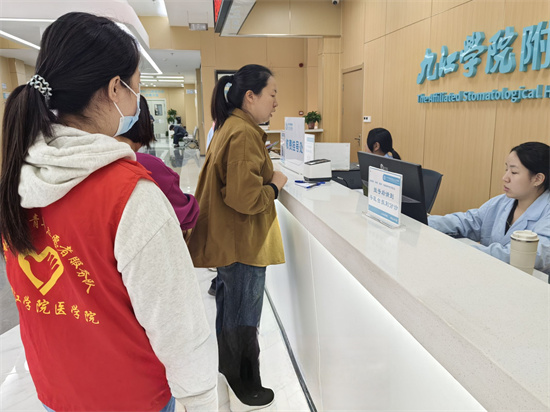 为了提升公众口腔健康意识,同时增强医学生的社会实践能力和在专业素养,基础医学院九医杏林青年志愿者服务队于九江学院附属口腔医院濂溪院区定时积极开展“导诊”志愿服务活动,本学期共开展活动70余次。