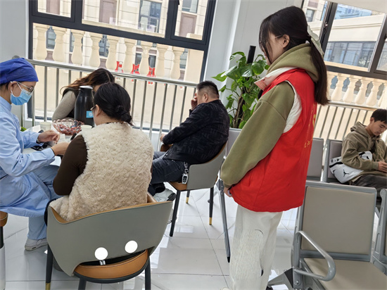 在志愿活动中,志愿者们身着红色马甲,坚守在不同的岗位,为患者提供导诊、咨询并协助他们使用自助服务机等多项服务,显著提高了患者的就医效率和体验。