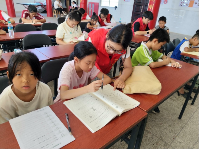 实践队依据孩子们的年级特点进行分组专项辅导,精准对接不同年龄段的学习需求。对于幼升小的孩子,队员们从最基础的字母表教起,帮助他们做好升学的识字准备,激发对学习的好奇心;针对二三年级的孩子,队员们着重纠正他们的握笔姿势和坐姿,通过规范的字帖练习,培养良好的书写习惯;而对于高年级学生,则着重辅导他们的暑期作业,指导他们学习背诵下学期的古诗词,深入解析诗词内涵,共同解决数学和英语作业的疑难问题。
