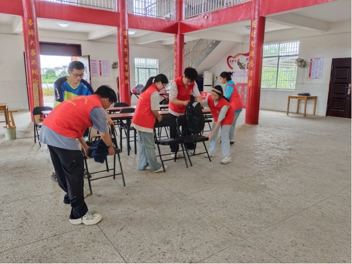 清晨,实践队首站抵达瑶前村支部委员会。村委书记对实践队的到来表示热烈欢迎:“乡村振兴需要知识赋能,医学生下沉基层开展教育实践,正是为农村孩子打开看世界的窗口。”在村委的支持下,队员们协助采购并搬运小黑板、文具套装、科普手册等支教物资。随后,在瑶前村新时代文明实践站,大家分工开展场地布置,有的队员手持扫帚清理墙角积尘,有的队员逐张调整课桌椅间距,还有的队员调试投影仪与无线网络,为后续教学活动做好充足准备。