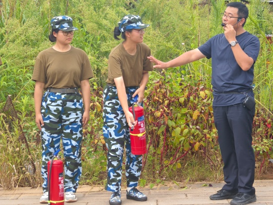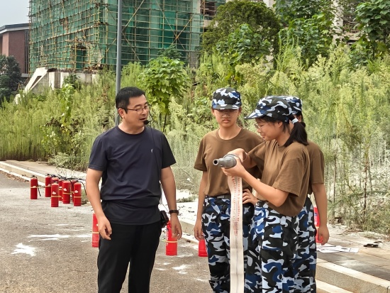 随后,老师们详细介绍了灭火器的使用方法,并通过“一提、二拔、三握、四压”的口诀帮助学生记忆。现场还让学生重复操作步骤,确保每位新生都能熟练掌握。“实战环节’中新生们则亲自使用灭火器扑灭模拟火源,体验了从判断火情到实际灭火的全过程。这一过程有效增强了他们在面对火灾时的应变能力和实战信心。此外,老师们还演示了消防栓的使用方法,指导学生在遇到较大火情时如何正确展开水带、连接管口并进行有效扑救,同时强调:“小火要用灭火器,大火要用消防栓”,不同的火情需要采取不同的应对策略。