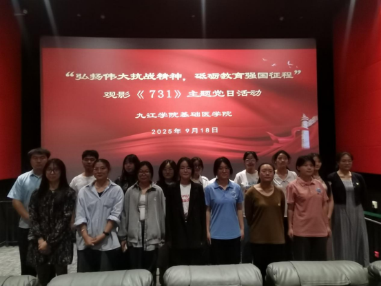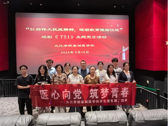 2025年9月18日是九一八事变爆发94周年,上午10时的防空警报响彻天空,警示市民们铭记历史、警钟长鸣。在这特殊的纪念日里,九江学院基础医学院学生党支部组织全体党员和入党积极分子,在十里万达影城五楼,集中观看爱国主义电影《731》首映,以光影为媒传承红色记忆,厚植爱国爱党情怀。