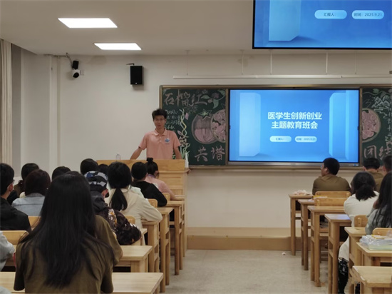 2025年9月21日,基础医学院依托大创项目"基于朋辈引领的大一新生创新创业能力提升路径研究",在基础A2521班和基础A2522班教室面向同学们开展"创新创业"主题班会。本次班会以朋辈视角切入,结合项目研究成果,系统解读创新创业知识,帮助同学们明确医学创新方向,激发其参与热情。