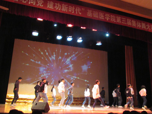 4月12日晚,基础医学院在大礼堂举办第三届集体舞大赛,基础医学院院长车向新,党委书记余朝阳,副院长许晓源,部分班主任、大一学生等到场观看了比赛。