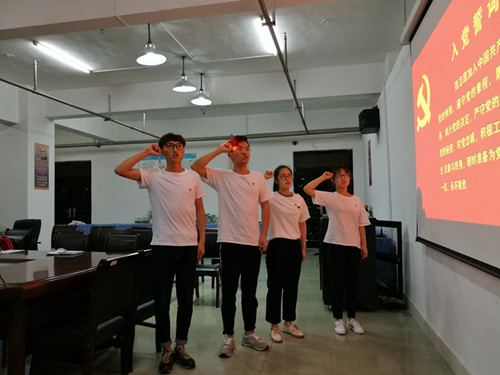 宣誓仪式在庄严的国歌声中拉开帷幕,学生党支部书记黄涛首先宣读了学院党委批准同意吸收四名发展对象为预备党员的决定。然后在黄涛老师的带领下,4名发展对象右手握拳举过肩头,面对鲜红的党旗,进行了庄严的入党宣誓,表达了为共产主义事业奋斗终身的决心。