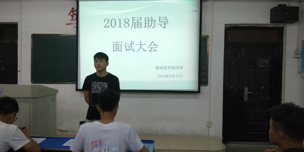 助导选拔,举办2018届助导面试。经过12天的艰苦训练,为检验和深入了解助导的训练成果,筛选出有能力的助导,6月13日晚,基础医学院于华文楼103举办助导面试大会,特邀学生会主席团担任面试评委。