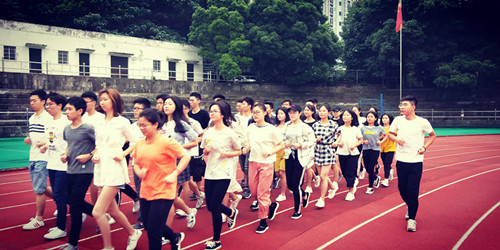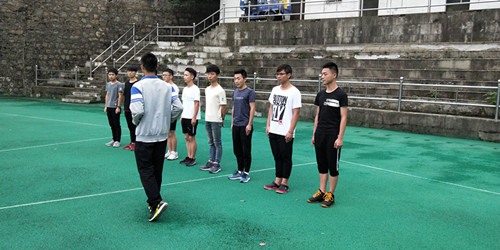 第一天培训主要集中在“停止间转法”、“齐步跑”和“立定”动作训练要领掌握。首先,负责人李鹏飞讲解军姿站法,要求助导们两脚跟靠拢并齐,两腿挺直;收腹、抬头挺胸、身体前倾,两眼目视前方;手指并拢,中指贴于裤缝,军姿站立三分钟增强耐力。各小组负责人亲自分解示范与指导,带领各自队伍于空地进行“齐步跑”训练,严格把关,助导们用心听小组负责人口号,每一个口令一下达,同学们都尽最大努力认真完成,严格要求自己动作整齐划一。“1、2、3、4——”在响亮充满朝气的口号中,各小组立正,齐步跑等动作训练已见成效,都能做到排面整齐,动作规范无误。最后,全体人员集合成方阵,绕操场齐步跑完一圈,队形整齐。