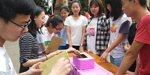 活动开始,成员们在欧风园设置活动站点,张贴宣传海报,将“神秘信封”置于纸盒中,由过往同学们抽取一份。每份信封中装有成员们精心挑选,写下最真挚的祝福与问候的明信片。活动中,同学们被新颖别致的“神秘信封”吸引,纷纷上前抽取,也有同学现场拆开信封,在看见明信片上温馨寄语时,还以成员们一句真诚的感谢。书信“漂流”活动拉近了人与人之间的距离,传达了最真挚的情感,也为同学们提供了一个表达心声、传递温暖的平台,鼓励其主动关心身边的人。