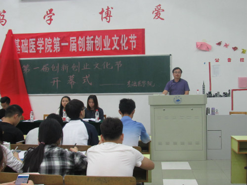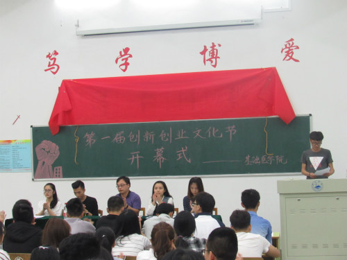 为进一步培养大学生创新创业意识并提升大学生创新创业精神,5月8日晚,基础医学院在华阶二举办了第一届创新创业文化节开幕式。基础医学院团委负责人黄涛、学生会团总支主席团、创新创业部成员以及各班班干参与了此次开幕式。本次开幕式由团总支学生第一副书记杨宁主持。