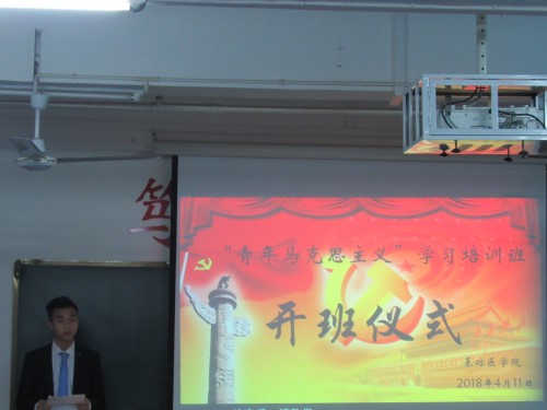 4月11日晚,基础医学院学在浔东校区华文楼103室举行“青年马克思主义”培训班开班仪式,学院党委书记余朝阳、团委负责人黄涛、学生会主席团、2017级学员共30余人参加。