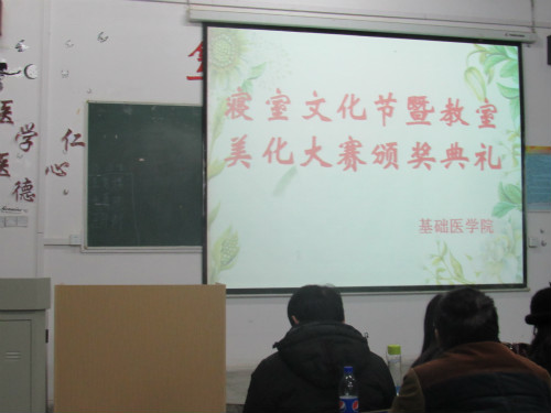 1月7日晚,基础医学院于思阶五举行寝室文化节暨教室美化大赛颁奖大会。基础医学院团委负责人姚中平,学生科负责人郑锋,各班班主任,学生会主席团成员,以及各班班长、生活委员、劳动委员,获奖寝室寝室长参加了会议。