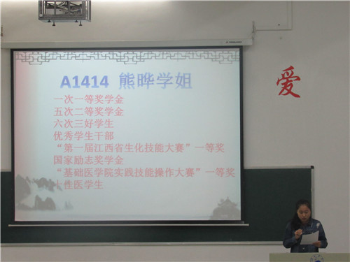 会议开始,已转至临床医学院的三位同学进行了学习经验和心得交流:姜玲同学介绍了她的学习方法,她告诉大家首先要树立一个明确的目标并为之奋斗,要结合学习视频,课后习题,辅导讲义来打下扎实基础,让坚持成为一种习惯,勿忘初心。吕秋晨同学则告诉大家学习要与生活相结合,扎实的基础可以帮我们知其所以然和减少考研准备时间,学习英语不是为了应付考试而是让它成为一种能力。而熊晔同学讲述了何为学习,如何成为一名优秀的医学生,要学会静下心来学习,学习的精髓在于理解,理解的基础在于记忆,再次声明了基础的重要性。