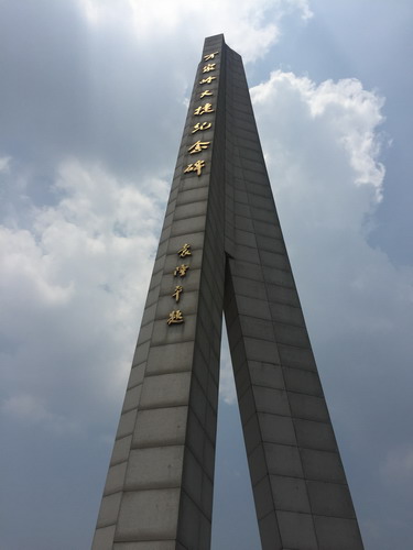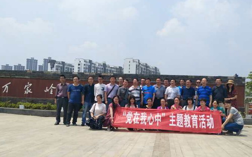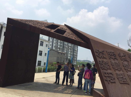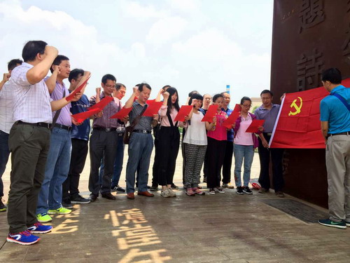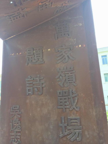 进门往前看,一座特殊的建筑,吸引了我们的主意。整座建筑是用铁块铸成,锈迹斑斑,上面雕刻着一首《万家岭大捷赋诗》。那斑驳的锈迹象征着历史的久远,那首诗提醒我们不要忘记那段历史。党员们聚集在建筑前重温入党誓词。