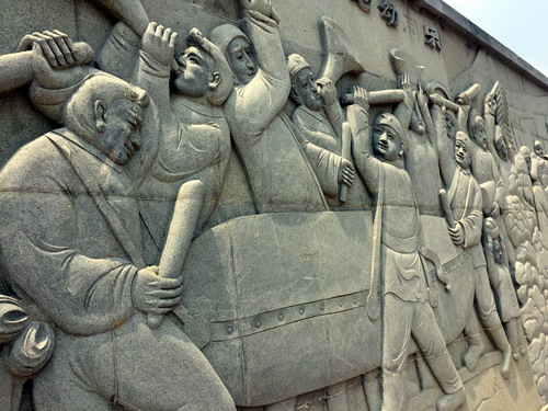 从大石头处往右拐,是一座桥,走到桥的尽头,向下看,是一本石头做成的特大的书,上面雕刻着文字介绍,记录了万家岭的位置、战役的过程。书的当头是一面浮雕墙,雕刻着参加此次战役将士们的全身像及他们的姓名。书的右侧是一面墙,上面有许多突起和一些洞,墙的后面有一些鬼子丢盔弃甲的铁像。看着这一切,不由想起当年战场的艰难,胜利的来之不易。