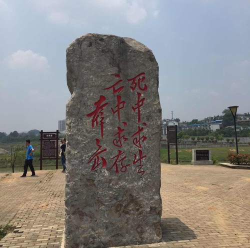 往前走,路中间竖着一块巨大的石头,上面刻着“死中求生,亡中求存”几个鲜红的大字,题字的是薛岳。从那几个苍劲有力的大字中,我们可以感受到当年“薛老虎”是以怎样的决心带领着将士们浴血奋战,夺取战斗的胜利。