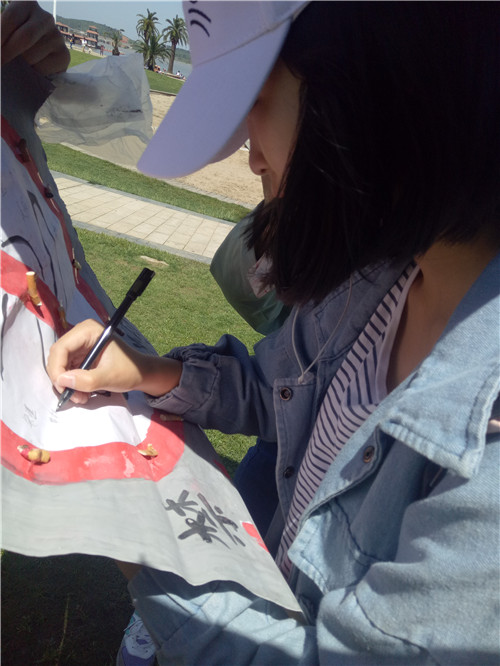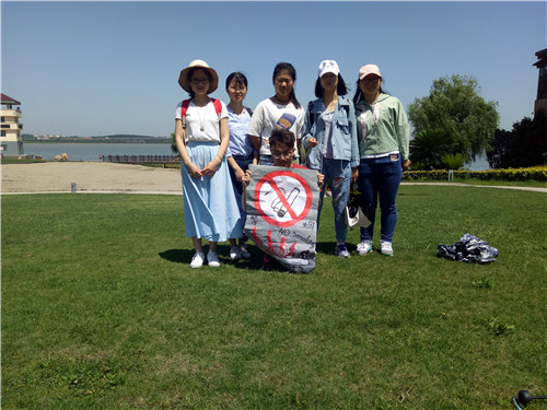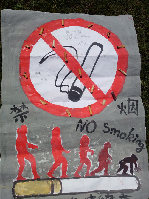 同学们在八里湖沙滩周边帮忙清扫烟头,他们将烟头收集起来,粘贴在禁烟标识上,开始举着海报行走宣传禁烟的重要性,之后由全体参与活动同学在禁烟标识上签名,以表禁烟的意念。