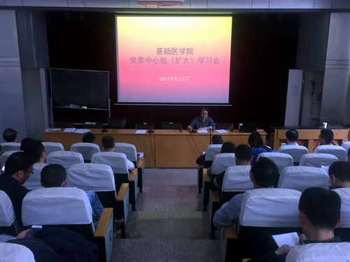 5月5日下午,基础医学院在立本楼报告厅召开了党委中心组(扩大)学习会。基础医学院党委班子成员、全体党员及教职工代表参加了学习会。基础医学院党委书记余朝阳主持会议。邀请了马克思主义学院赵文博士作了“撸起袖子加油干,增强人民获得感!——深入学习和贯彻2017年两会精神”的讲座。
