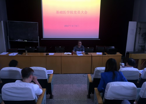 5月5日下午,基础医学院在立本楼报告厅召开了全体党员大会,党委班子成员及全体教职工党员出席会议,余朝阳书记主持会议。
