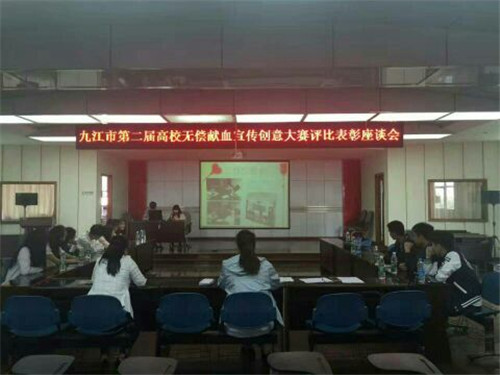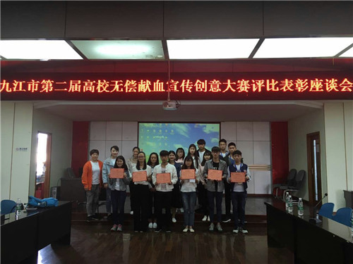 近日,基础医学院青年志愿者服务队与其他高校献血服务队在九江市中心血站共同参加第二届高校无偿献血宣传创意大赛评比表彰座谈会。