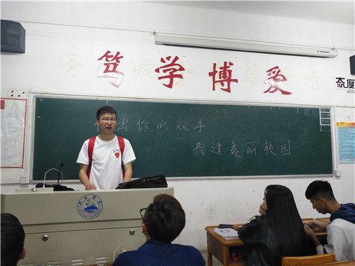 首先各班团支书上台发言,给同学们讲解此次团日活动的意义。接着学生代表发言,谈及自己对本次团日活动的理解与看法。他说到,校园是我们共同的家园,我们应该携手并进,为建设一个更和谐美好的校园作出贡献,让爱充满校园的每个角落。同时,学生代表也提及到建设和谐校园的意义,让同学们更深刻的理解与支持,为建设校园付出自己的一份力。最后团支书号召全班同学走出班级,走出寝室,伸出双手,打扫校园,为积极响应此次主题,为共建美丽校园出一份力。