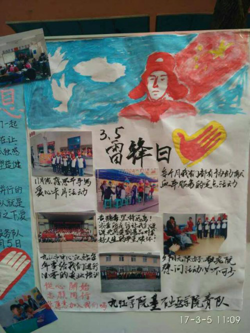为落实向雷锋同志学习的号召,激发学习雷锋的热情,提高志愿服务意识,三月,基础医学院以广大青年喜闻乐见的方式向全校学生宣传雷锋精神,开展了阳光康复中心聋哑学校捐献及走访,雷锋日启动仪式及其宣传,南湖公园生态环保,余家垄社区敬老院献爱心以及不依赖手机和网络的无网日活动。