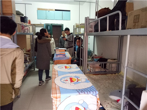 本次检查主要针对大二的男生寝室,对他们的每间寝室卫生进行检查,每到一间寝室,穆欣等人都仔细检查了寝室的卫生状况并同时对一些物品的摆放进行了指导,其中328寝室的卫生状况比较不错,干净的地板,整洁的床铺,都让人感到十分舒服。
